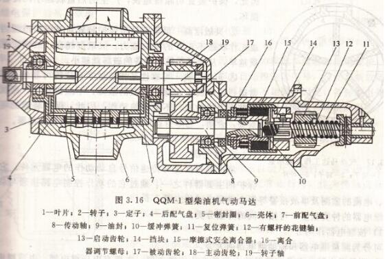 定子和前后配氣盤通過定位銷固定在殼體上,而轉子葉片自由放入轉子軸向槽外,帶葉片的轉子組在定子的偏心孔內旋轉。轉子的頭部裝有主動齒輪18,與被動齒輪17相齒合,其轉速比為17/37,起減速、增大轉矩的作用。傳動軸通過摩擦式離合器將將動力傳給齒輪13,起動齒輪內孔有右螺紋與螺桿相配合螺桿左段是一個花鍵軸,花鍵部分安裝在離合器花鍵孔內。當轉子轉動時立即傳到螺桿,小齒輪應慣性作用從螺桿后端甩向飛輪,與啟動齒輪嚙合。