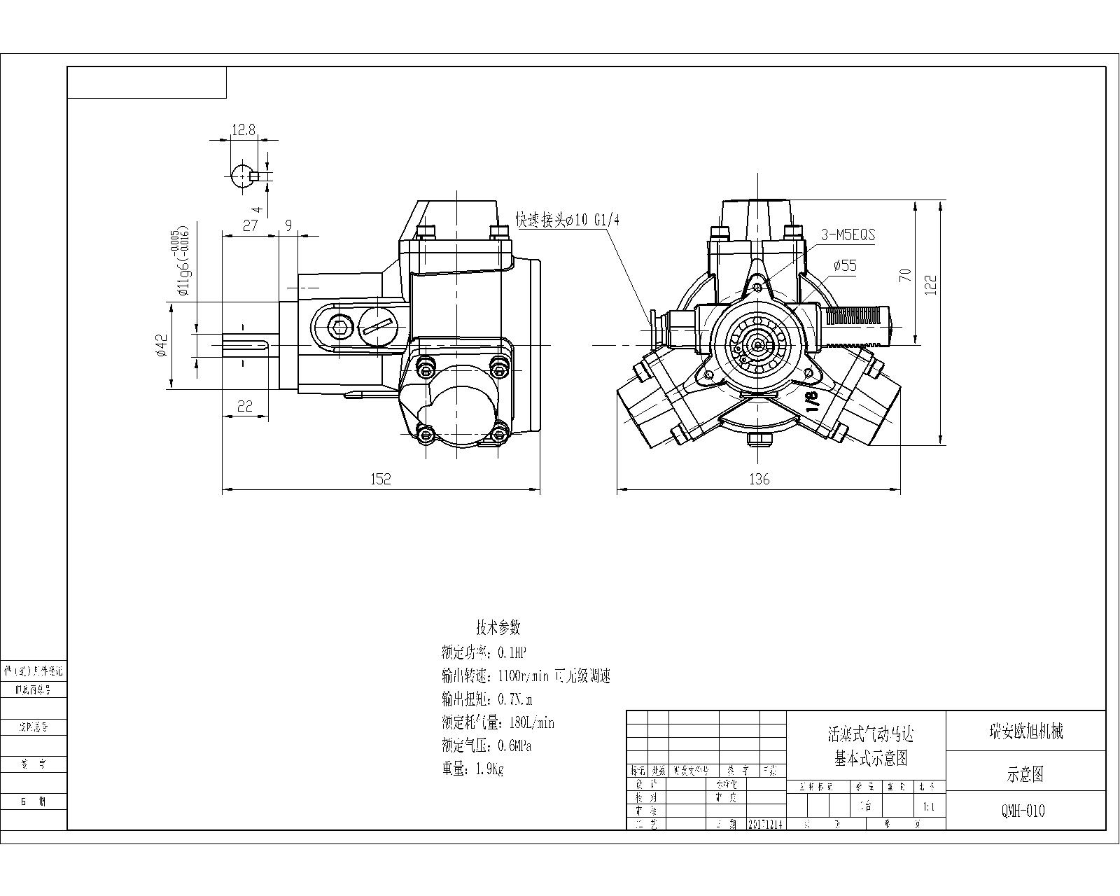 型號:QMH010 安裝尺寸: 材質:①殼體:ZL111鋁合金;②軸承:瑞典進口SKF或德國BEM;③輸出軸(轉子):40CR; ④其他:球墨。 產品描述:①QMH010活塞式氣動馬達,耗氣量小、轉速較快、扭矩較大、重量輕,具體的參數請看下表;
