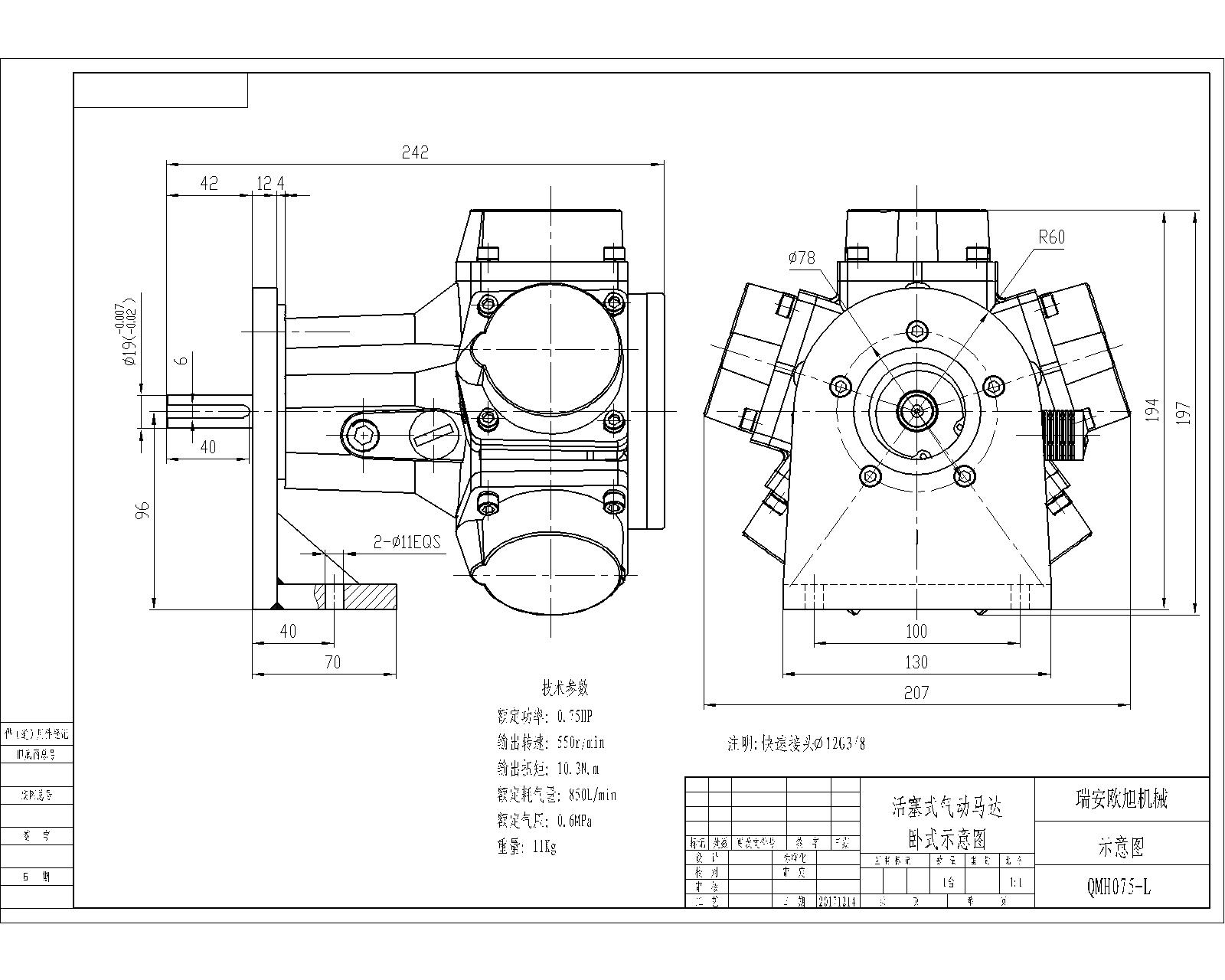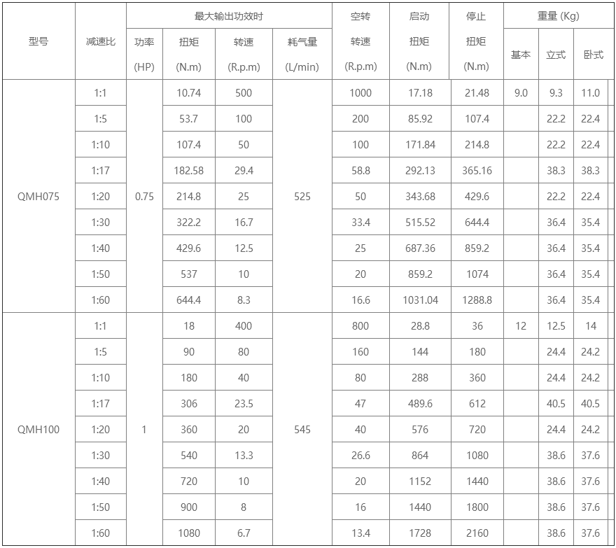 材質:①殼體:ZL111鋁合金;②軸承:瑞典進口SKF或德國BEM;③輸出軸(轉子):40CR; ④其他:球墨。 產品描述:QMH075-F活塞式氣動馬達,耗氣量小、轉速較快、扭矩較大、重量輕,具體的參數請看下表;